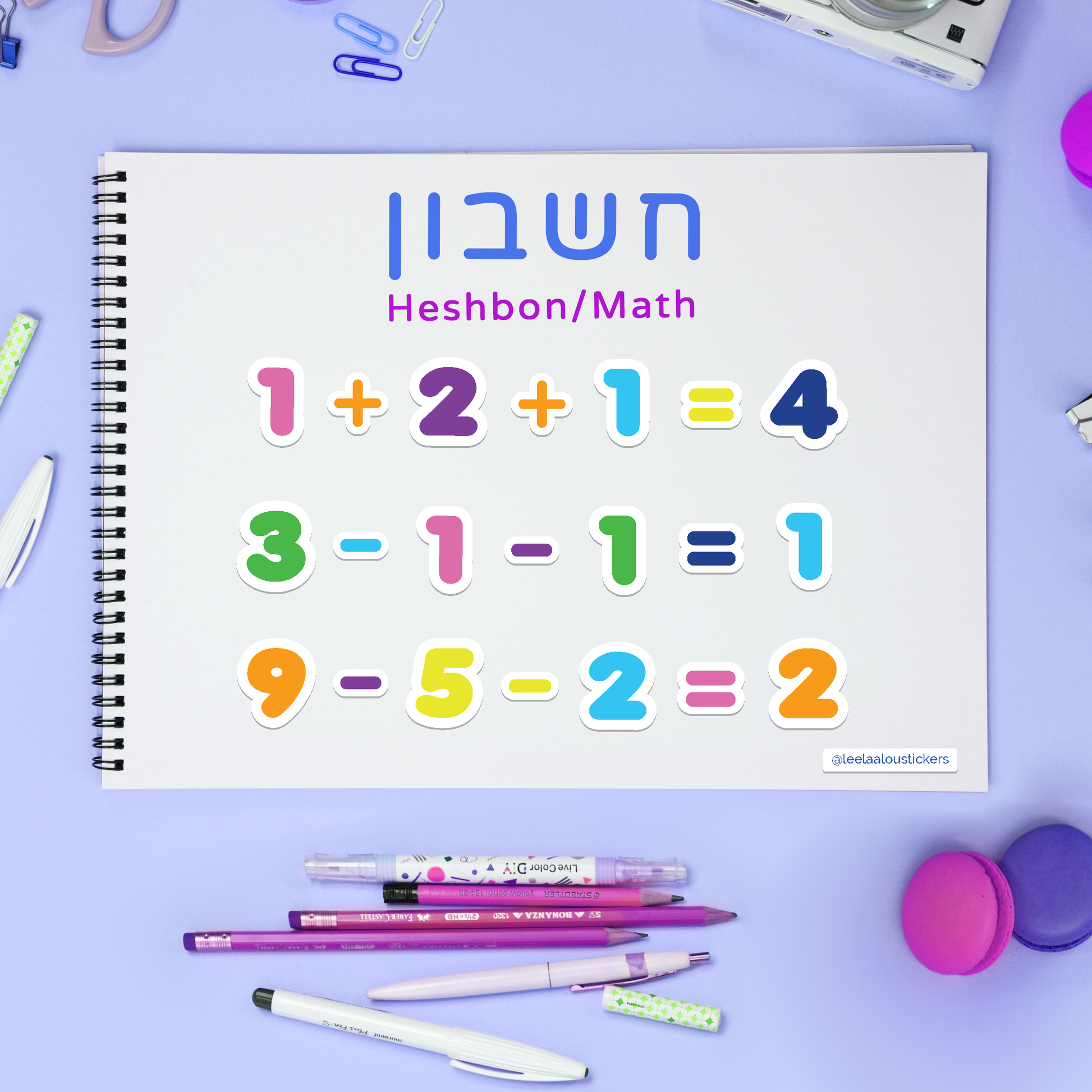 A single package includes 4 sticker sheets (two sheets of numbers and math signs, and two sheet of Hebrew text and transliterated stickers).