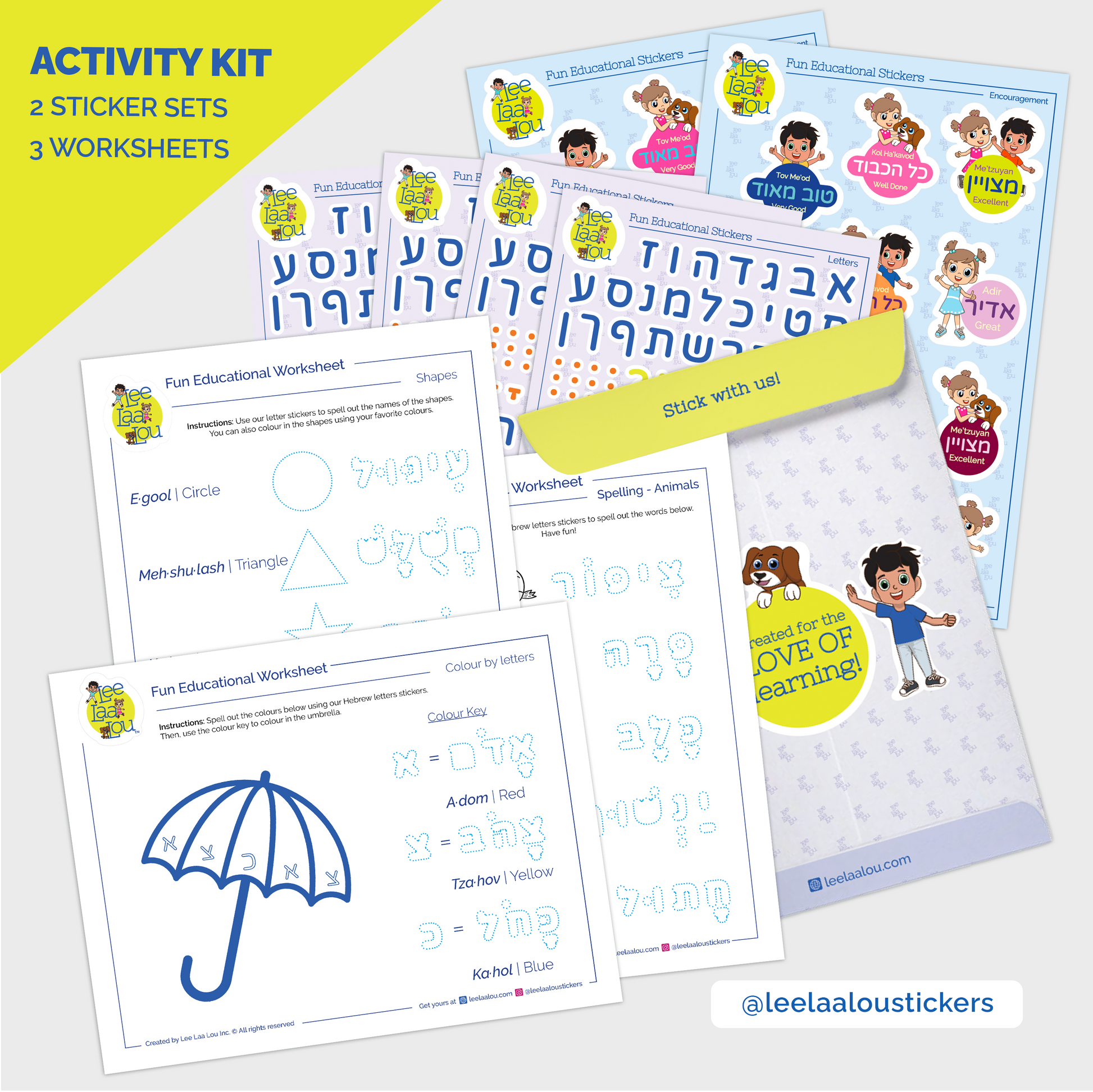 This kit comes complete with 2 sticker sets and 3 activity sheets (animals, shapes, and colour by letters). This kit helps with: