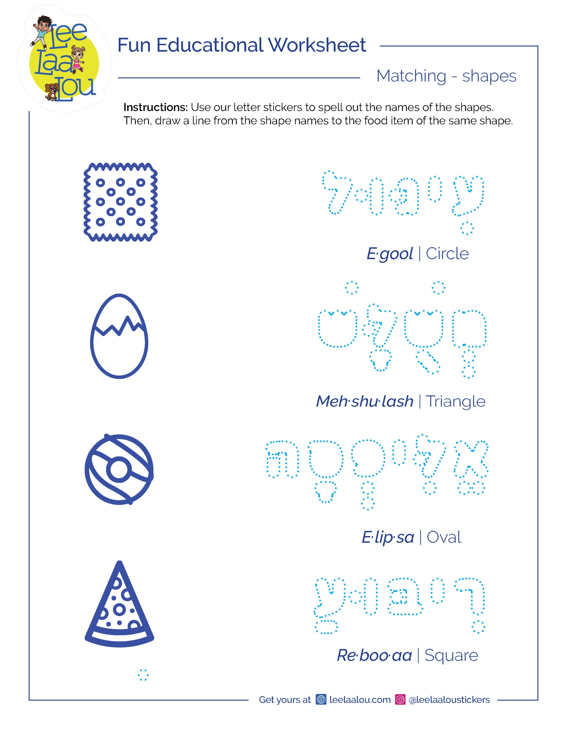 Spell and match the right word to it's corresponding shape. Use our letter stickers to spell out the names of the shapes. Then, draw a line from the shape names to the food item of the same shape.
