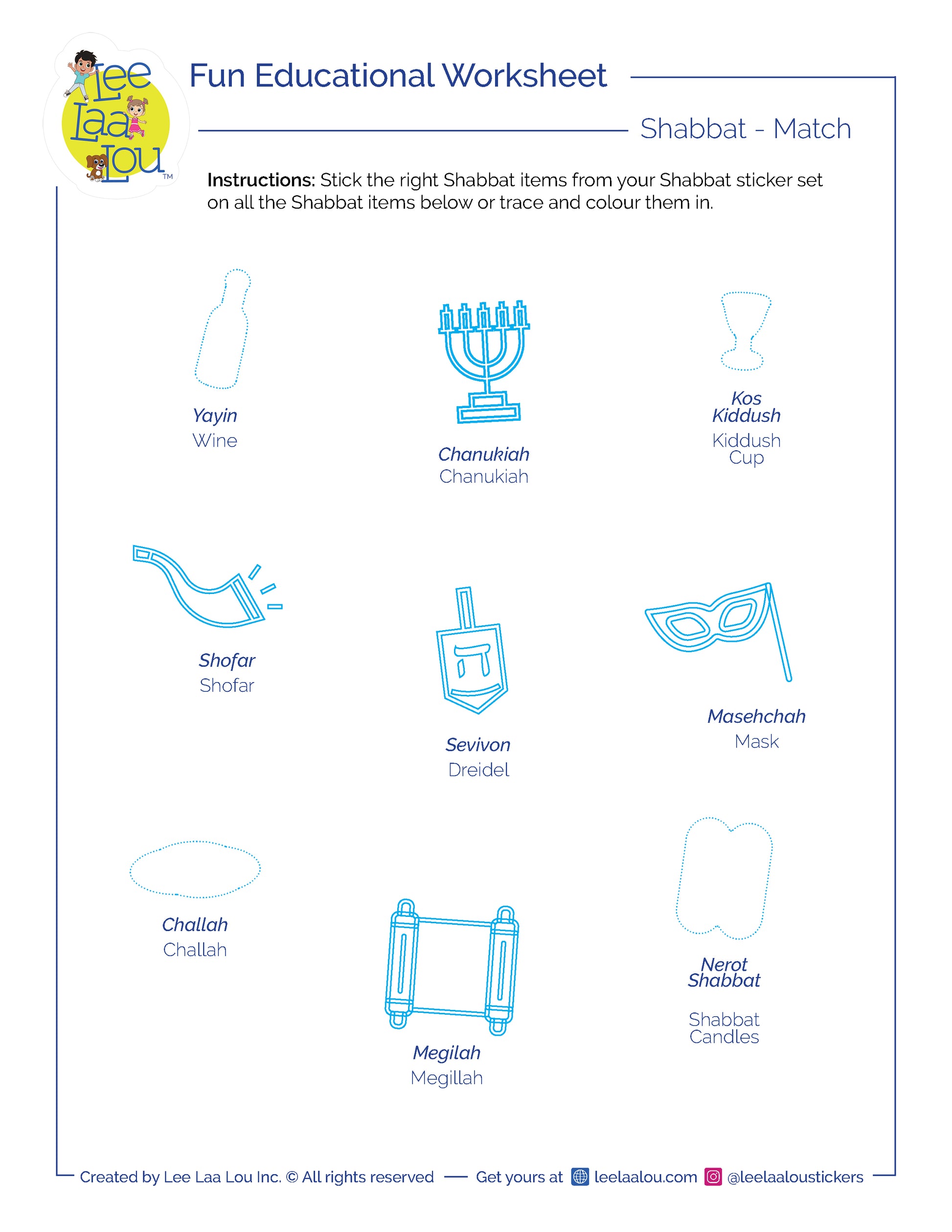 Stick the right Shabbat items from your Shabbat sticker set on all the Shabbat items below or trace and colour them in. Then circle the items related to Shabbat.