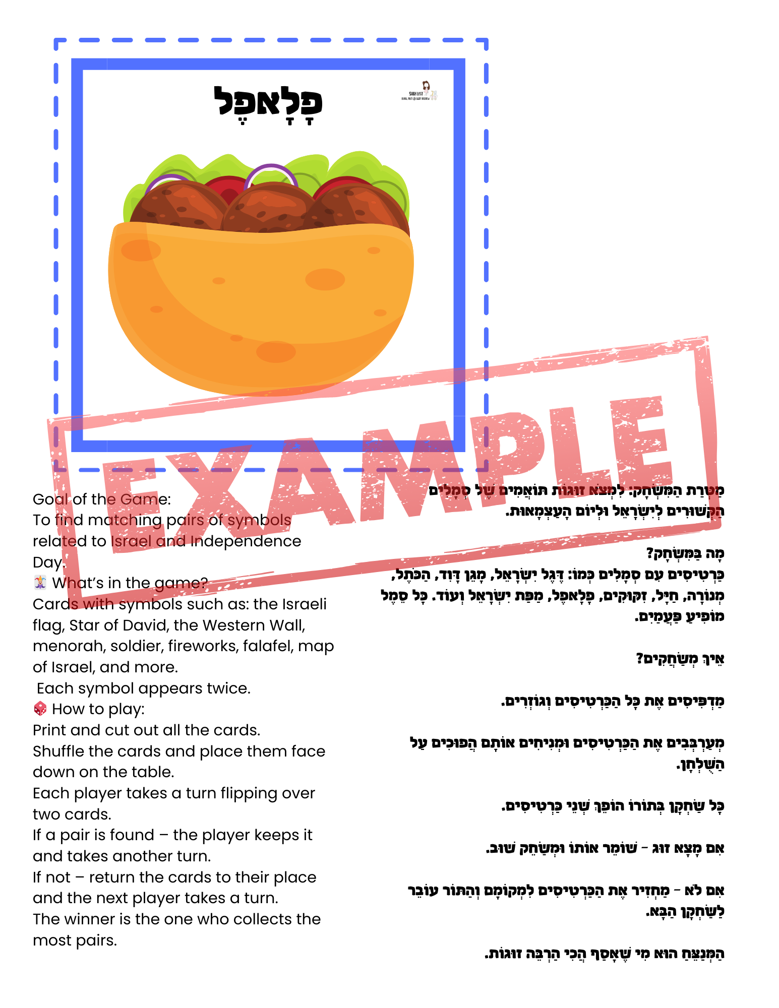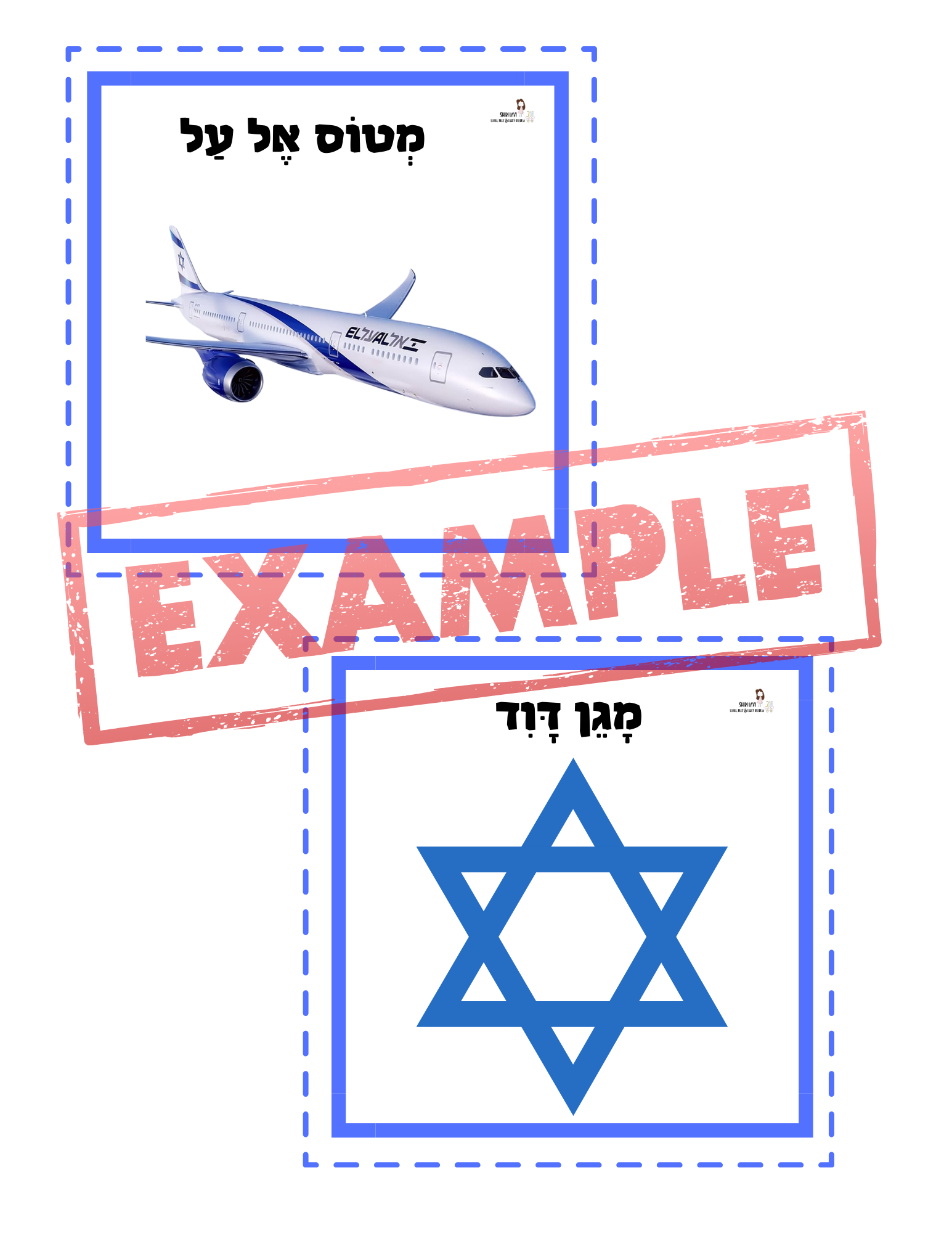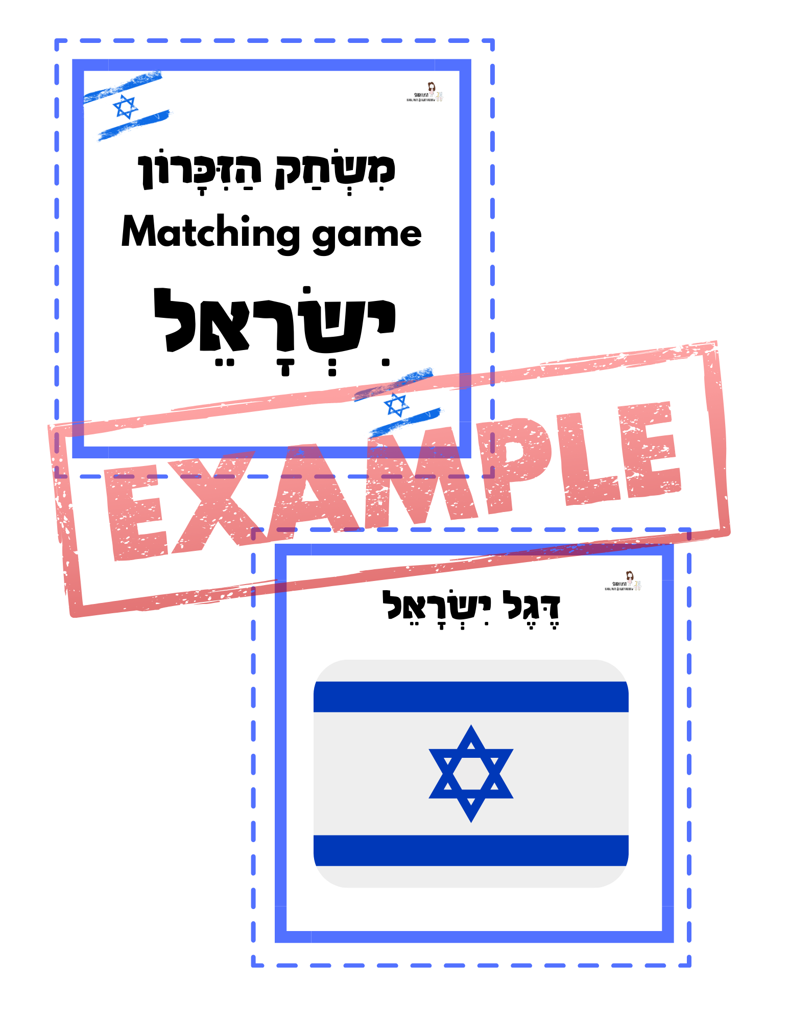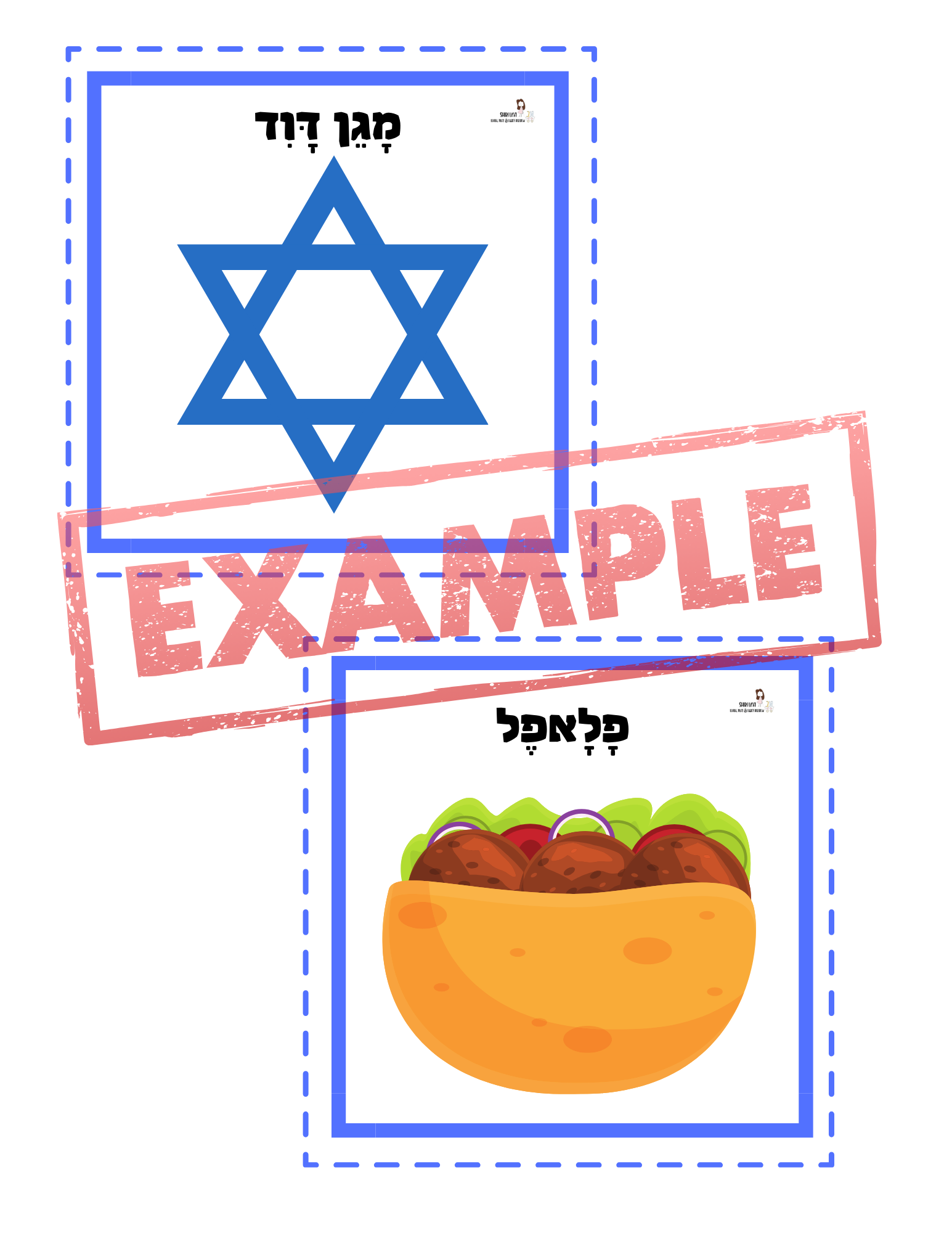 This set includes colorful matching cards featuring iconic symbols of Israel and Yom Ha’atzmaut (Israel’s Independence Day), such as the Israeli flag, Star of David, soldiers, falafel, fireworks, and more!